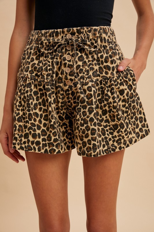 Pin Tuck Leopard Flare Mini Denim Shorts