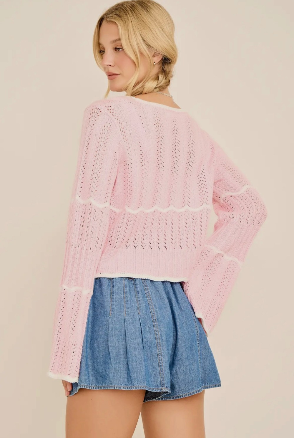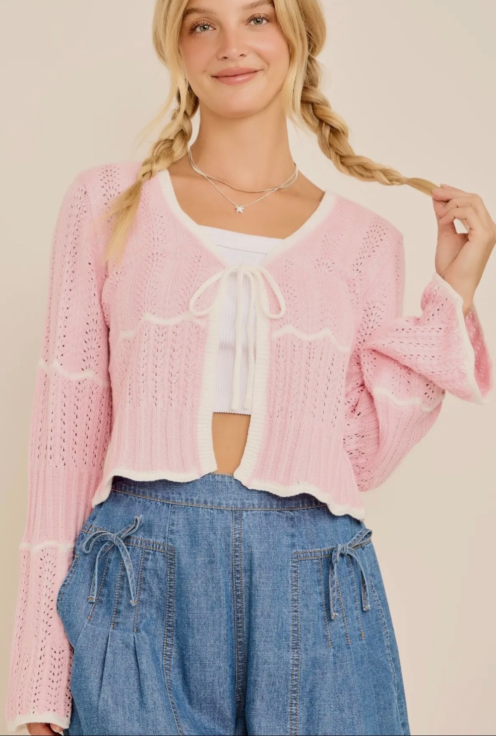 Home / Clothing / Pink Pointelle Front Tie Closure Sweater