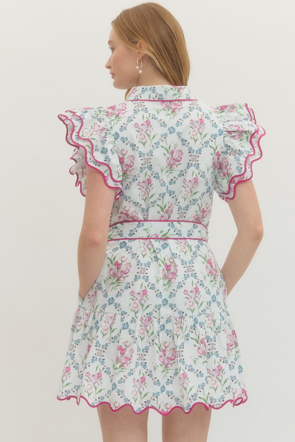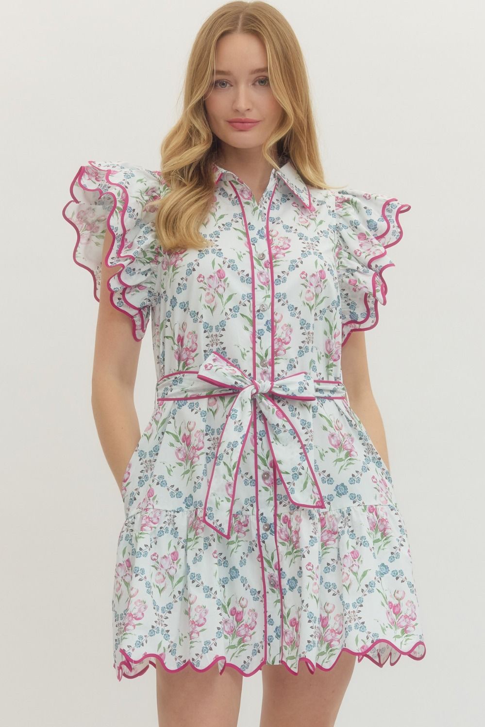 Cream/Fuchsia Tulip Ruffle Sleeve Dress w/ Tie Waist